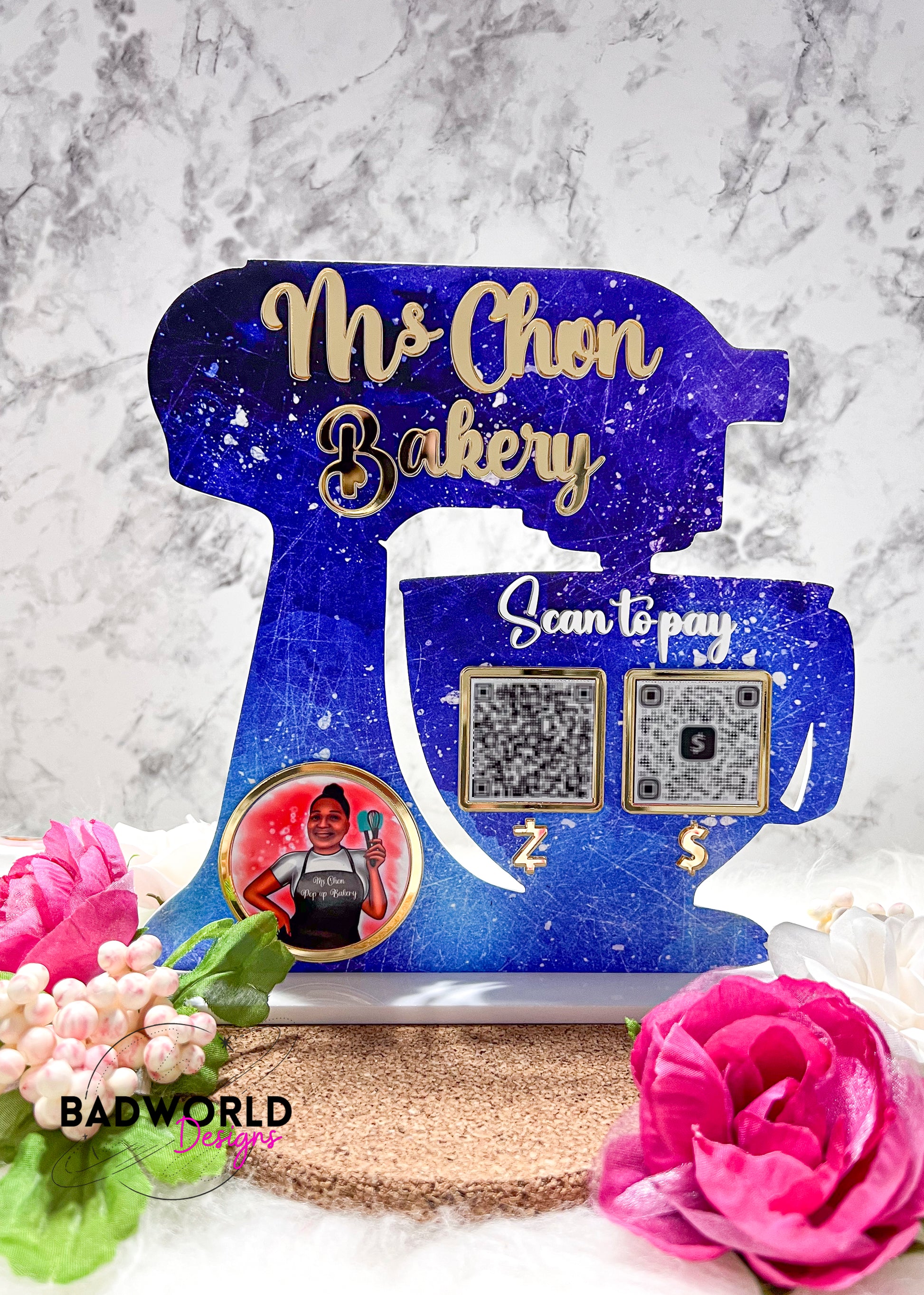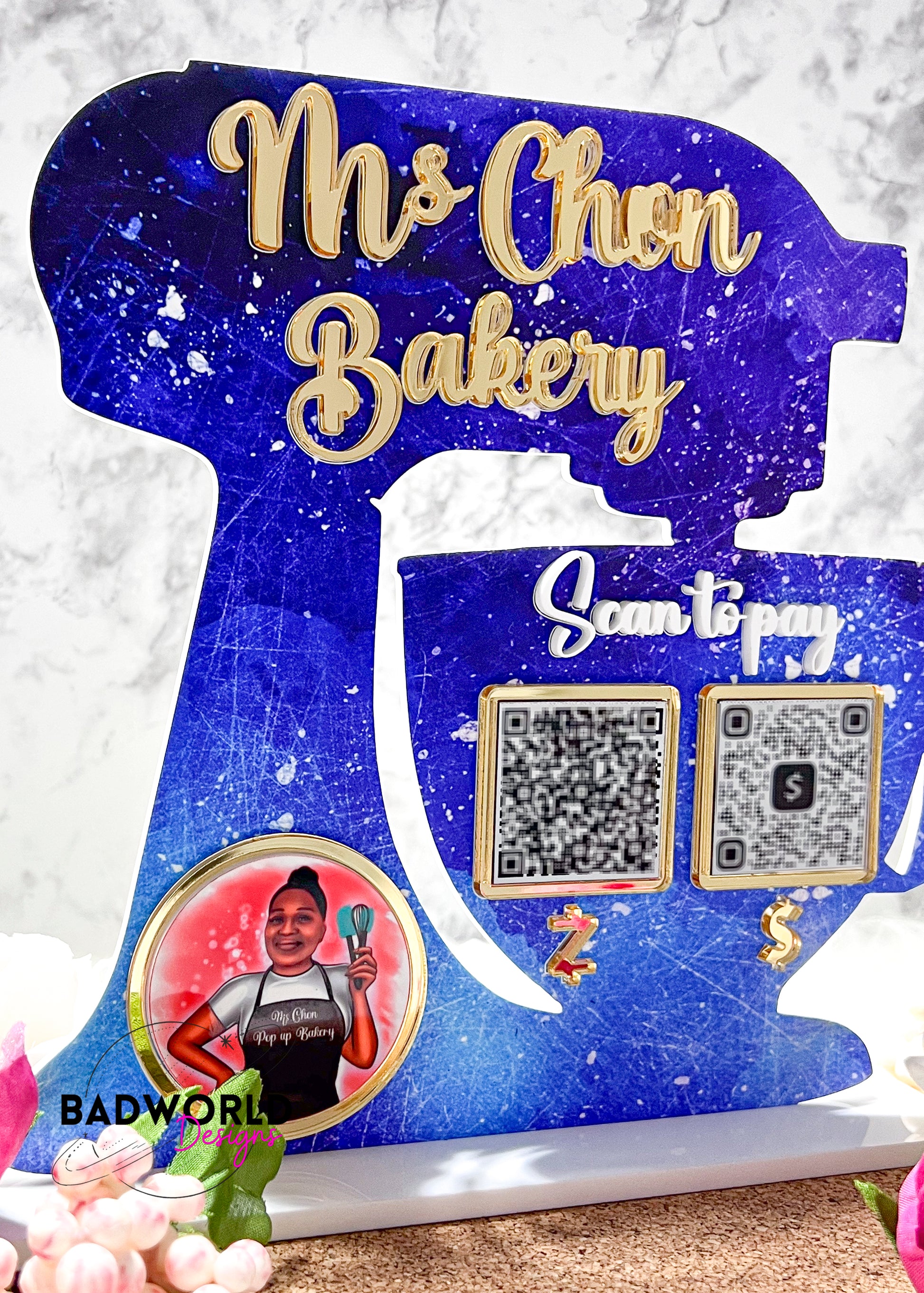 The Baker Market Sign is the perfect blend of eye-catching design and practical functionality. With its stand mixer shape, it's sure to give your business a unique and playful touch. Plus, it can fit up to two QR codes and your logo, making it a must-have for any modern marketing strategy.