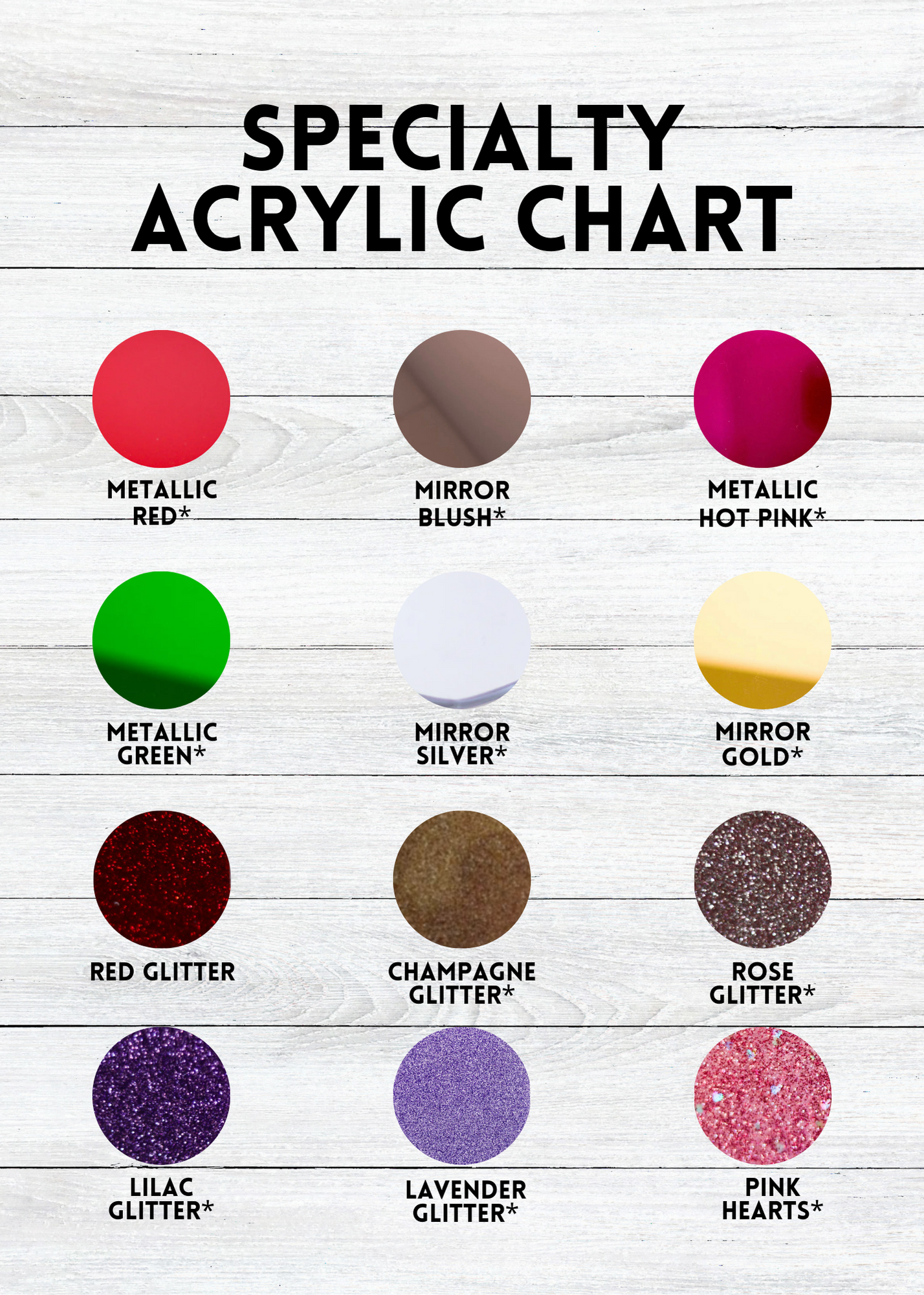 - Use the color chart and the space provided to enter your acrylic color choices.