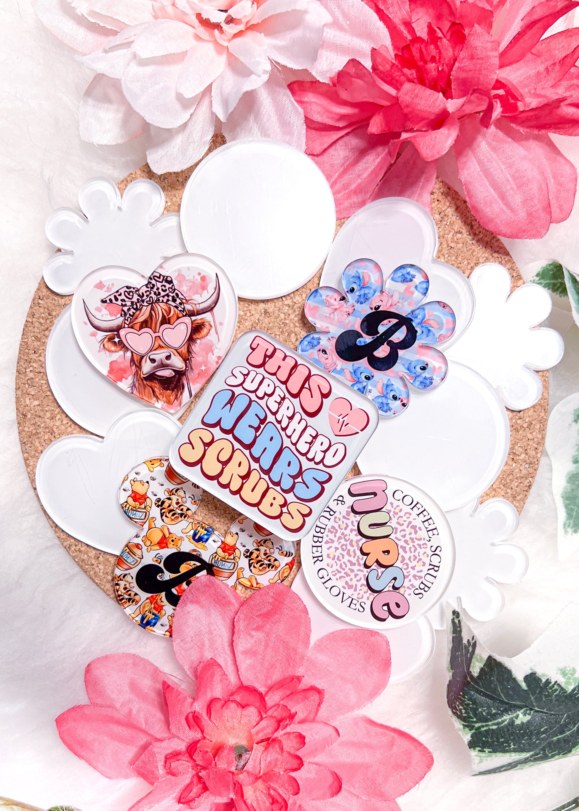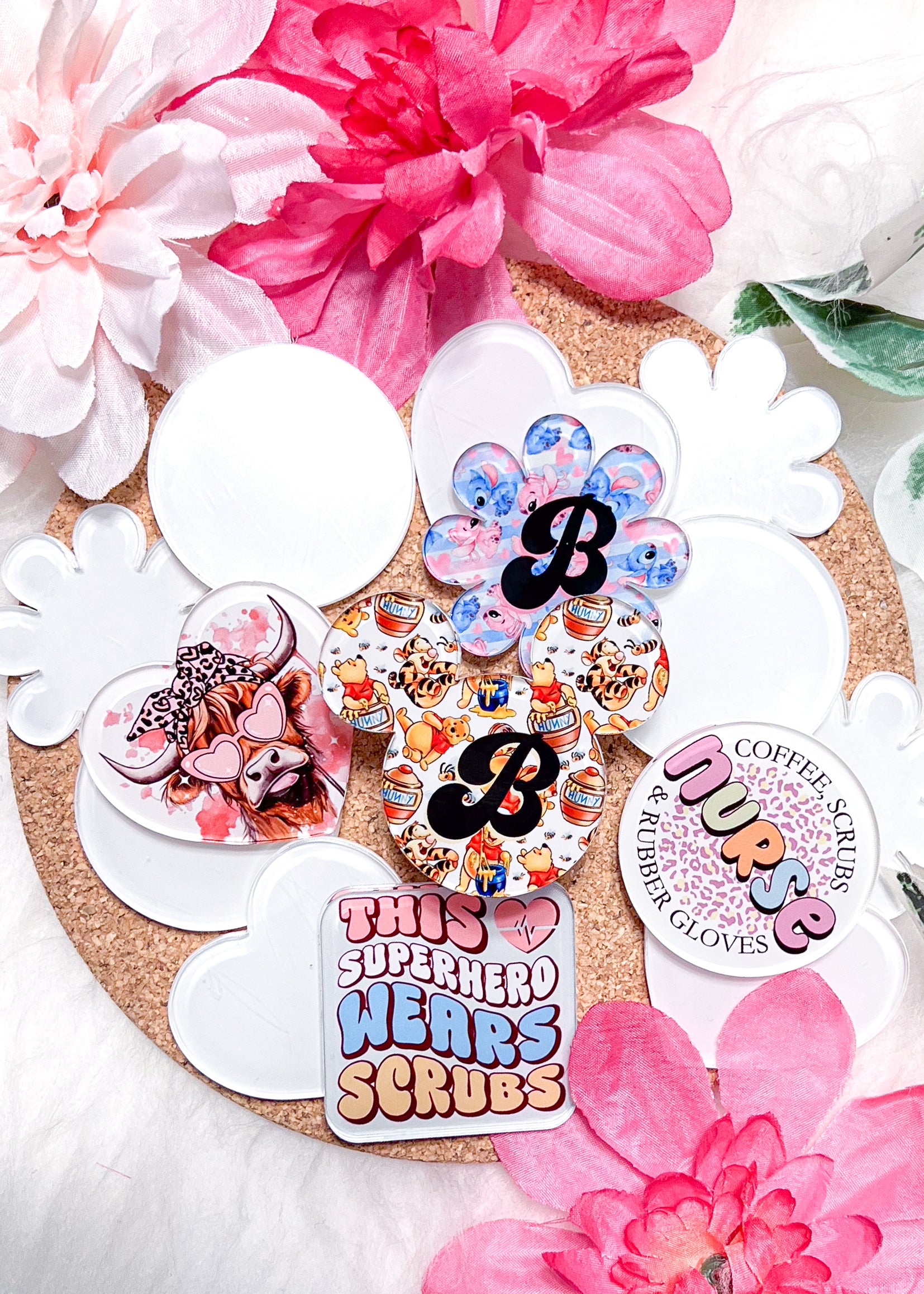 Add some flair to your shop with our Acrylic Blanks! These customizable blanks are laser cut for precision and fit most phone grips or badge reels. Spice up your every day routine with this accessory!